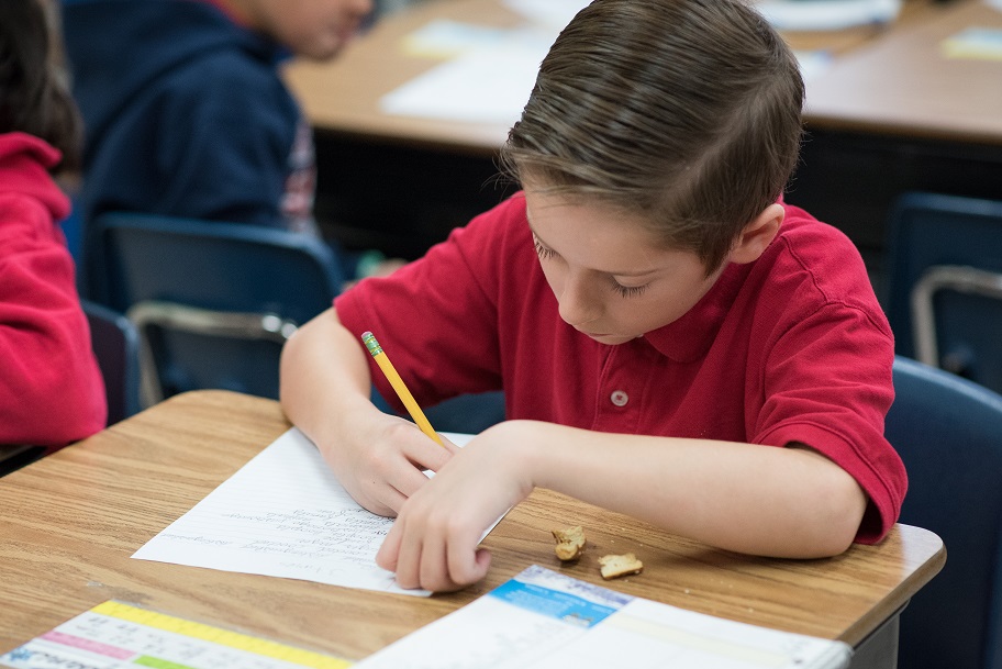 Students read novels in class, such as Shiloh, The Indian in the Cupboard, and A Wrinkle in Time. Independent reading is an essential part of the curriculum as well, and students select from different genres to create “book share” projects to present to their classmates throughout the school year. Supplemental reading from the McGraw-Hill reading textbook draws richly from a variety of genres, including biography, folktale, realistic fiction, historical fiction, and science nonfiction. Students employ a variety of reading skills such as summarizing and inferencing and study the elements of a short story because, we believe, proficient reading fosters prolific writing. Consequently, students will master efficient, polished sentence construction, while practicing elaboration skills, such as using specific details, vivid verbs, imagery, and figurative language.